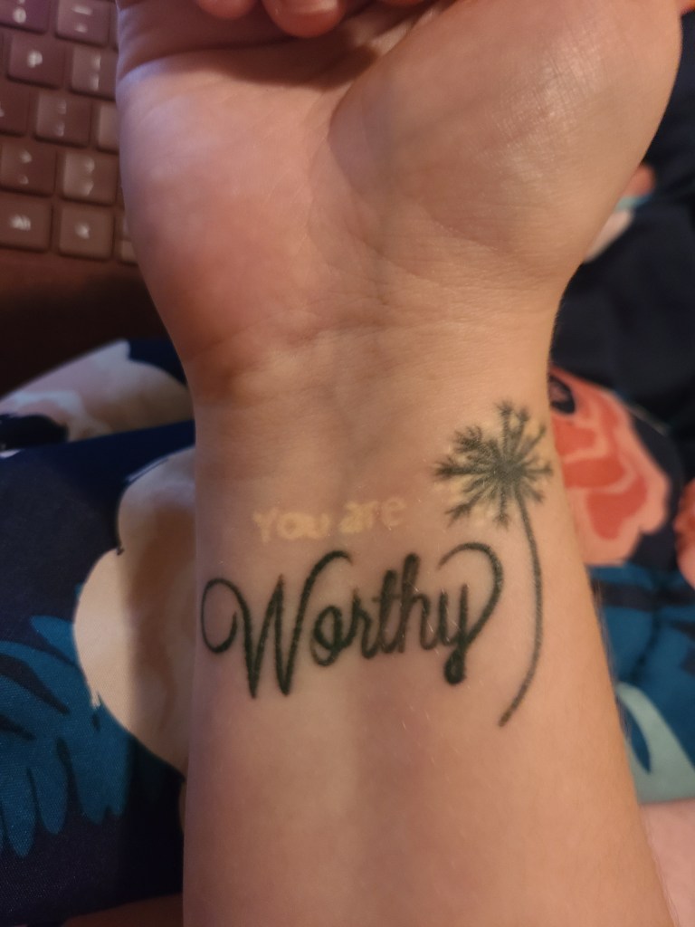 This fifth tattoo was planned immediately after I was raped on June 13th, 2018. Which was a week after I got my peony done. Two days after the incident, I contacted the woman who tattooed the peony on me and confided in her about what happened. She did a phone consult with me and we knocked out this concept in about an hour and $170 later… this is the final product. It reads, “You are worthy, Dandelion”.