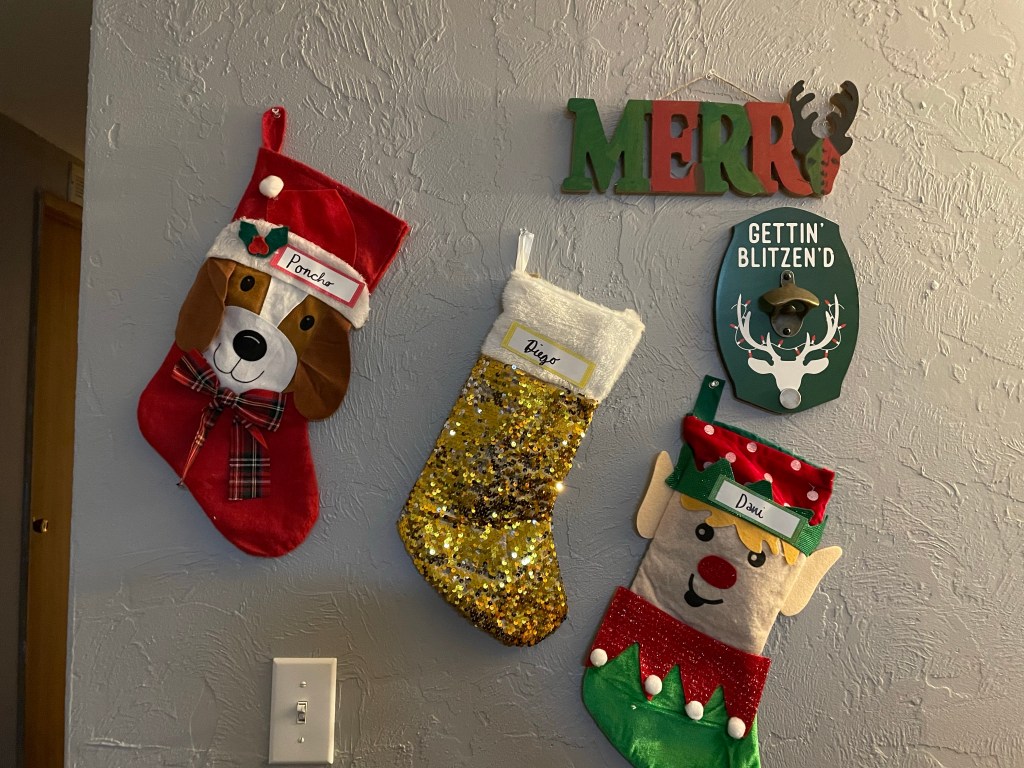The day prior to yesterday, I picked out these stocking pictured above and I got the doggy one for Poncho because his ears match the stocking ears. I got the elf for Diego and the sparkly stocking for me, but Diego wanted the “fun and fabulous” stocking so that’s why I am the elf. I painted the Merry sign myself with cheap acrylic paint from the dollar store and the “get blitzen’d” sign was from Diego’s mom last Christmas.